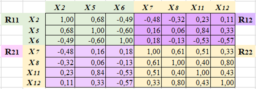 Построим выборочную корреляционную матрицу (рис.3), цветом выделены подтаблицы, по которым можно непосредственно определить долю объясняемой дисперсии.