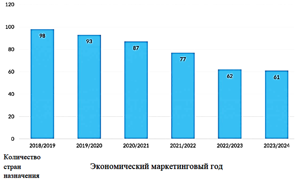 Смена географии экспорта. В 2018–2019 маркетинговом году российская пшеница поставлялась в 98 различных стран. Однако в последующие годы количество стран-импортеров постепенно сокращалось, несмотря на увеличение объемов экспорта, и достигло 62 рынков в 2022–2023 маркетинговом году, что связано с продолжающимися военными действиями (Рисунок 5).