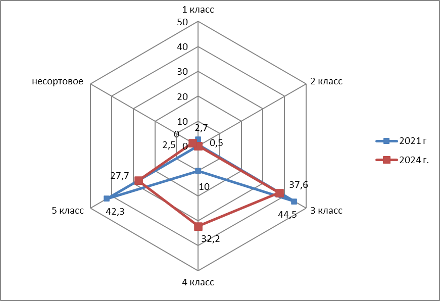 Отметим ухудшение качества зерна, соответственно, его конкурентоспособности. В 2024 году ФГБУ "Россельхозцентр" не было выявлено зерна 1 и 2 класса, зато несортового зерна – 2,5 %. В 2021 году преобладало зерно 3 и 5 класса, а в 2024 году – 3 и 4 класса.