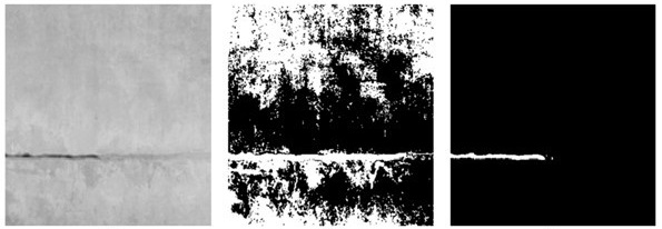 Рис. 2. Сравнение эффективности обнаружения трещин на слиянии изображений с использованием традиционного метода Оцу и усовершенствованного метода Оцу. (а) Слияние изображений; (б) традиционный метод Оцу; (в) усовершенствованный метод Оцу [10]