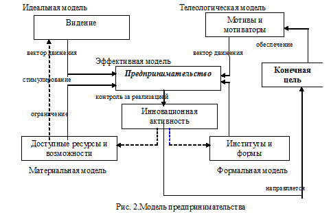 В таком виде предпринимательство есть функция не просто оптимальной координации и использования ресурсов, но и максимизации прибыли. Это функция, направленная на оптимизацию системы, состоящей и материальных и нематериальных факторов, на основе оптимального использования человеческого капитала, с учетом социальных критериев при формулировке и достижении цели. Вектор развитию предпринимательства задают видение и оценка имеющихся ресурсов и возможностей, что, в свою очередь стимулирует создание нужных институциональных форм для реализации видения и поставленных целей. С целью повышения качества модели в нее введены три косвенные связи, отмеченные пунктирными линиями. Инновационная активность влияет на уровень доступности ресурсов и реализации возможностей (прямая связь) и на формируемые институты, видение корректируется с учетом имеющихся ресурсов и видимых возможностей развития. Новая деятельность может создавать доступ к потенциальным ресурсам и формировать новые возможности. Изменение институтов и форм влияет через механизм обратной связи и интеграционные процессы на качество предпринимательства.