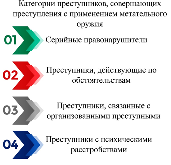 Типология личности преступников, совершающих преступления с применением метательного оружия, включает в себя широкий круг лиц с различным социальным происхождением, демографическими и поведенческими характеристиками. Понимание типологии личности преступников имеет решающее значение для правоохранительных органов при разработке эффективных методов профилактики, раскрытия и расследования преступлений. Среди преступников можно выделить следующие категории: