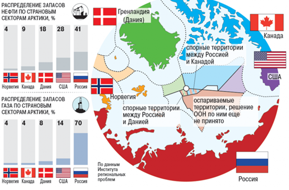 Рис. 1. Инфографика территориальных споров, соперничества между странами в вопросах расширения сфер влияния в арктическом регионе, а также распределение между странами запасов углеводородного сырья