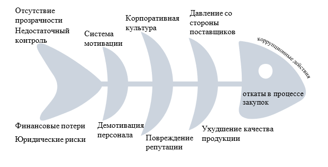 Анализ причин и следствий проблемы откатов в процессе закупок в компании может выявить фундаментальные проблемы, которые приводят к коррупционным действиям, и возможные последствия этих действий. Недостаточная прозрачность в процессе выбора поставщиков создает условия для коррупции, следовательно, компания переплачивает за товары или услуги, не получая лучшего качества или условий договоров. Слабые внутренние аудиты и контрольные механизмы не выявляют нарушений в процессе закупок, в следствие чего возможны юридические последствия за участие в коррупционных схемах.