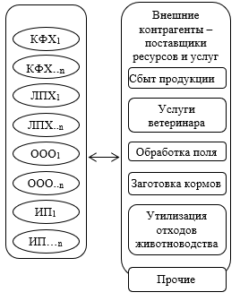 Любой экономический субъект в сельском хозяйстве связан с целым рядом поставщиков ресурсов и услуг (Рис. 1), контрольных и надзорных органов, в том числе, отраслевыми органами управления. Связь с каждым из них обеспечивает самостоятельная цифровая платформа, а иногда и не одна и связь с таким числом внешних контрагентов, делает состав любой платформы многосложным и в каждом случае индивидуальным.
