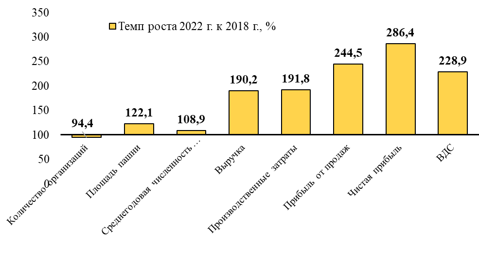 Для оценки эффективности современного предпринимательства в аграрной сфере Орловской области нами проведен анализ основных финансово-экономических показателей на основе сводной годовой отчетности сельскохозяйственных организаций за 2018-2022 гг., темпы их изменений представлены на рисунке 1.