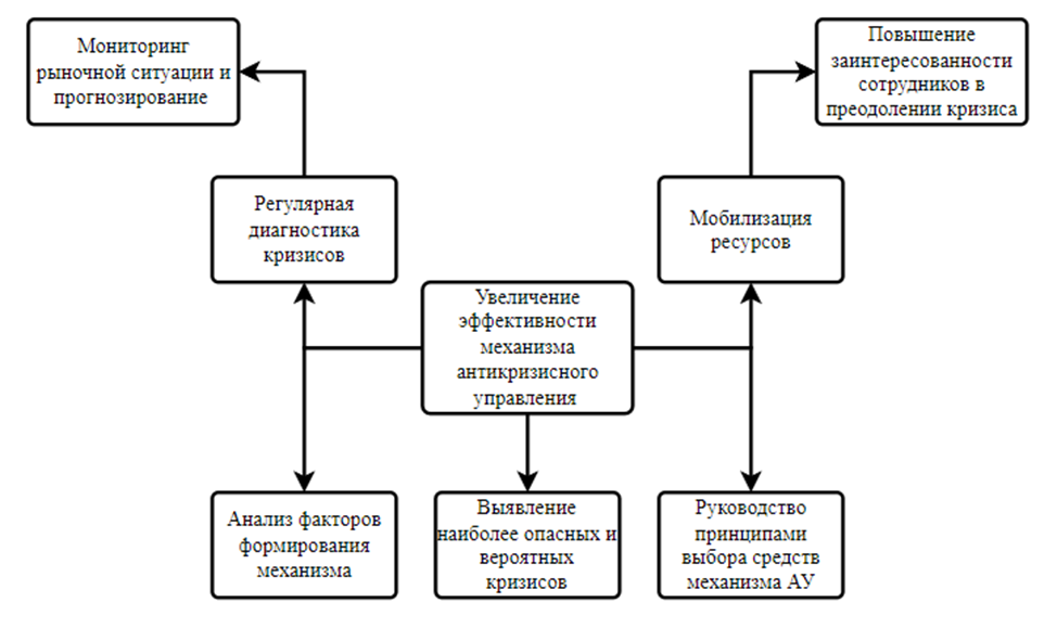 На наш взгляд, под механизмом антикризисного управления предприятием следует понимать систему организационных и управленческих мер, направленных на предотвращение, минимизацию последствий и преодоление кризисных ситуаций в деятельности предприятия или организации.